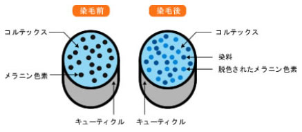 ●ヘアカラー(グレーカラー)とは アルカリ剤を使ったカラー剤でのカラーリングです。 髪の毛のメラニン色素をアルカリ剤で分解して脱色しながら髪の内部に染料入り込ませて定着させます。 そのため色持ちと発色がいいのが特徴です。